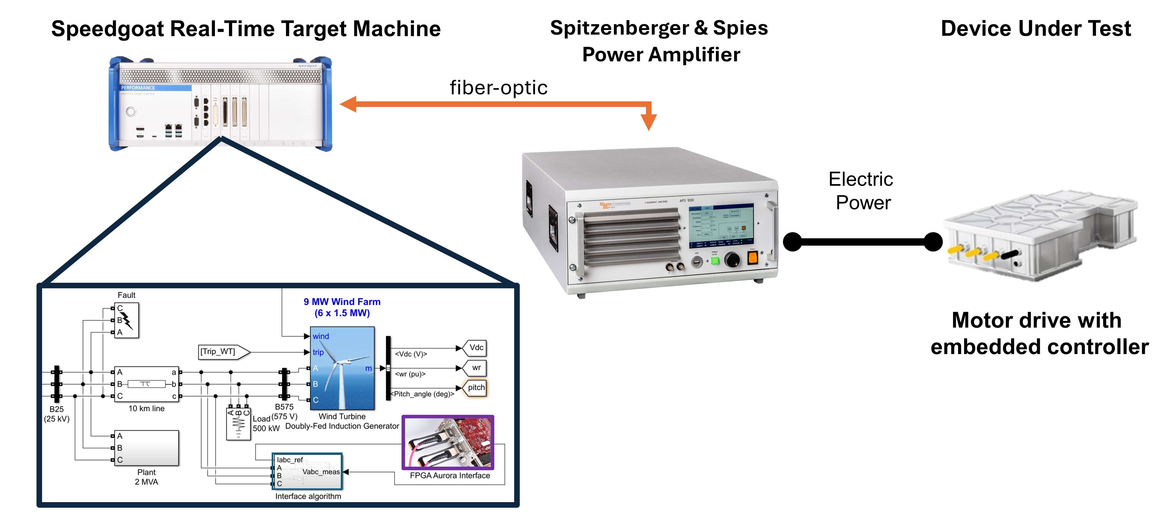 The Spitzenberger & Spies power amplifiers seamlessly integrate the power interface into your real-time simulation, enabling the emulation of electric motors, power grids, or vehicle systems. This allows you to safely test your electrical devices, such as inverters, motor drives, along with embedded controllers, without the risk of any damage.